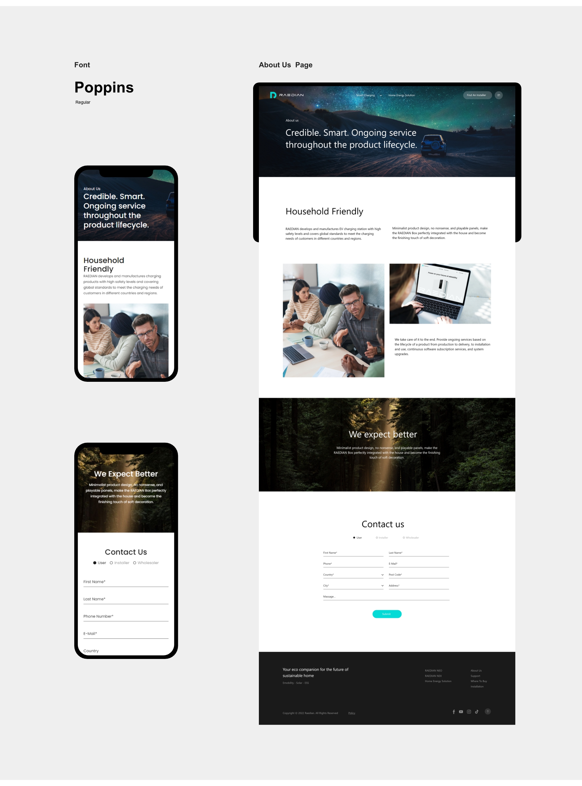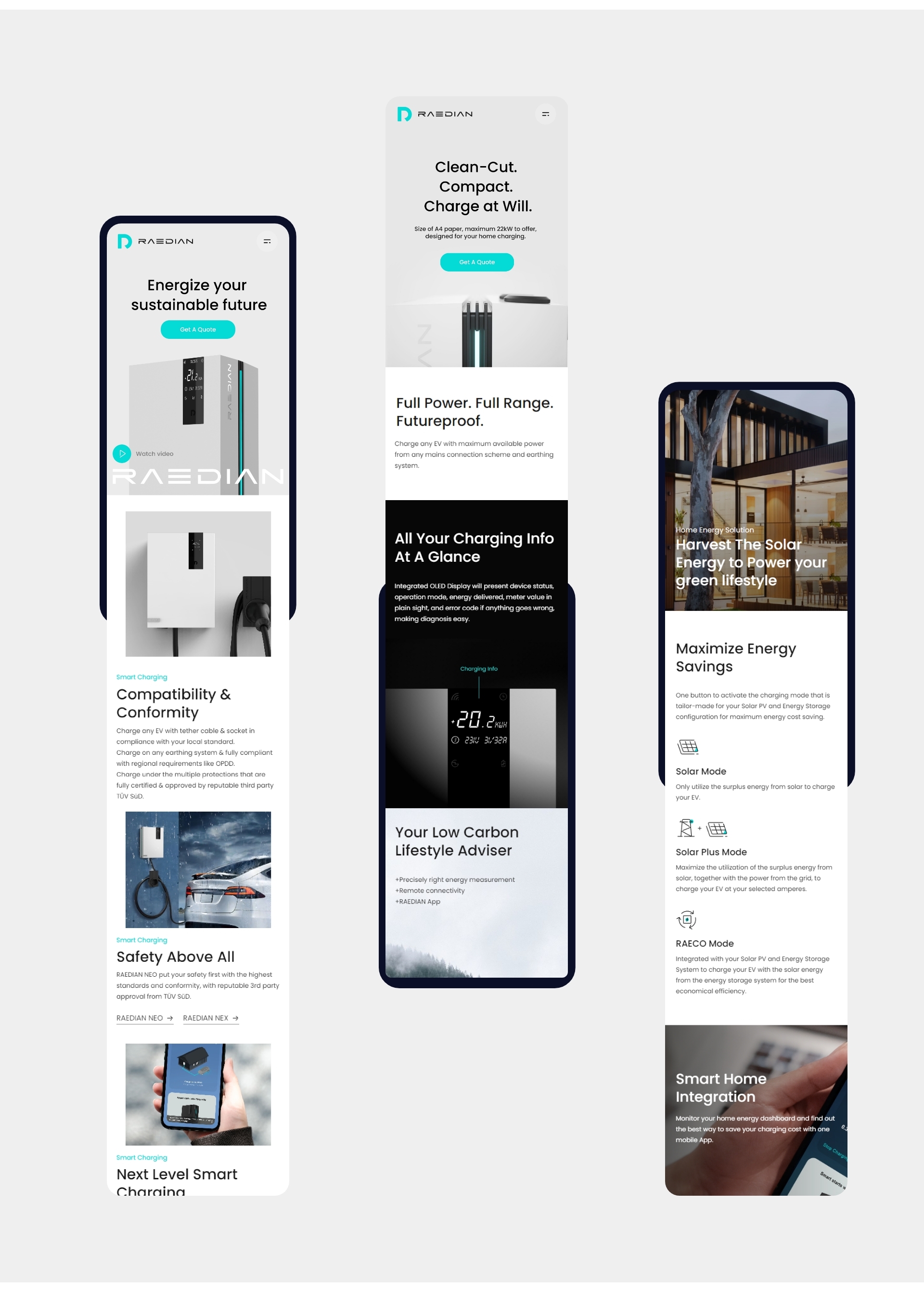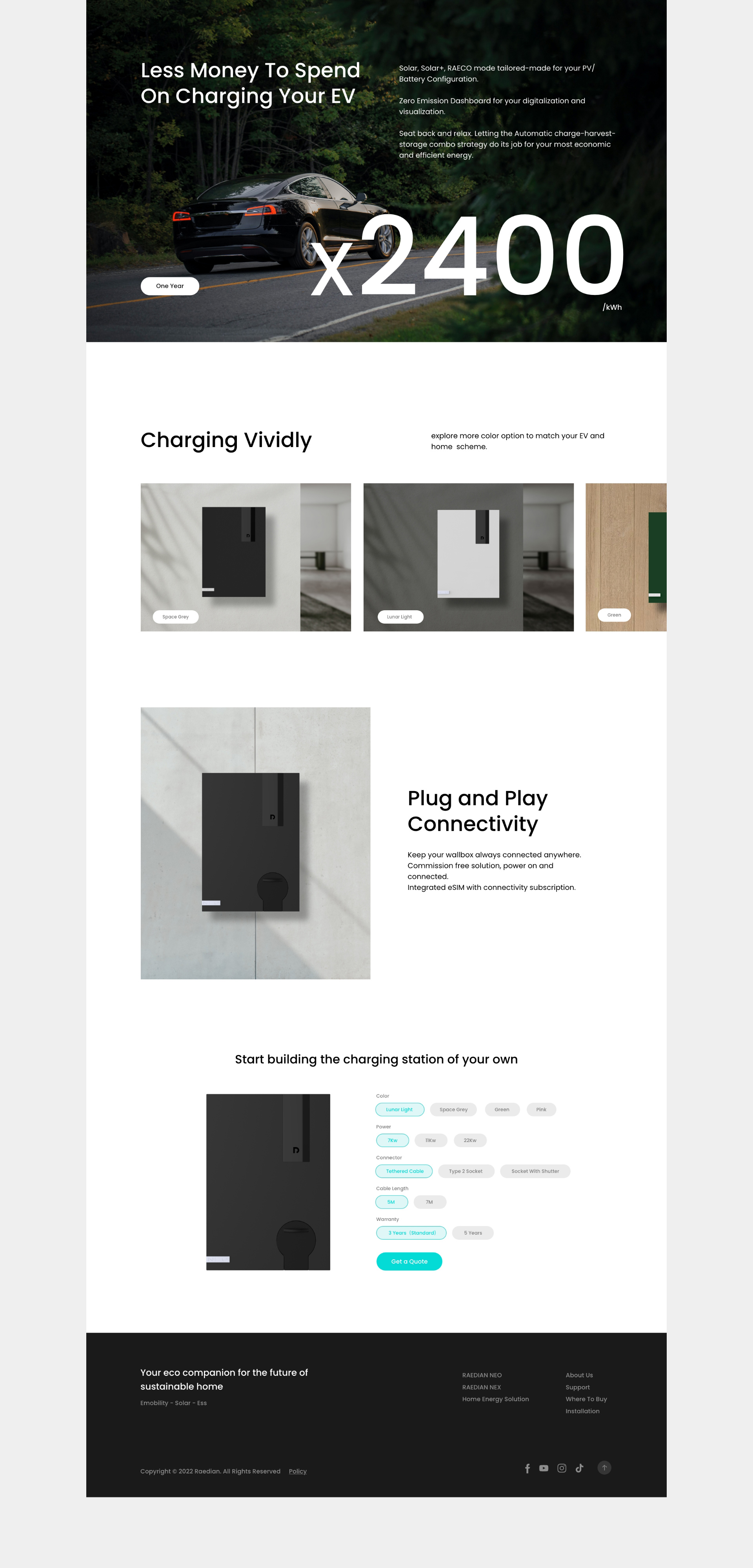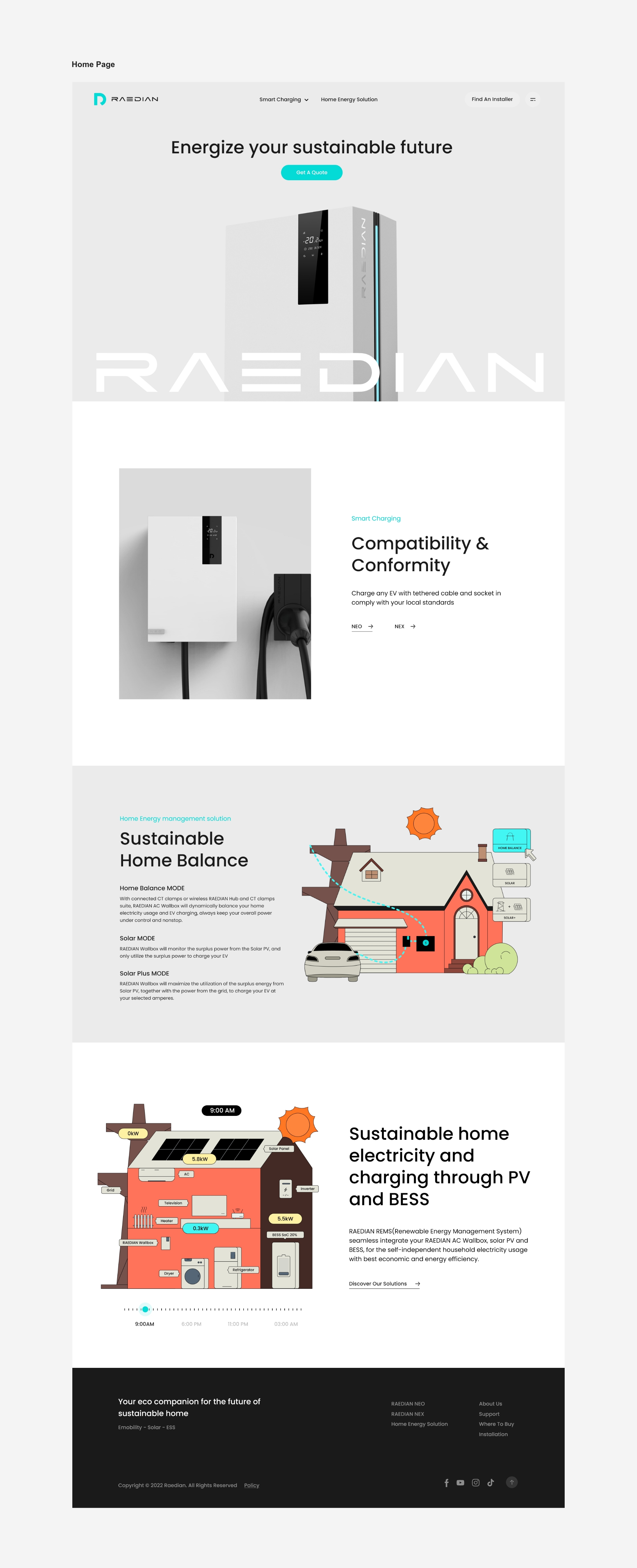 RAEDIAN develops and manufactures charging products with high safety levels and covering global standards to meet the charging needs of customers in different countries and regions.We take responsibility to the end. Providing continuous services throughout the product lifecycle from production to delivery, installation to use, and lifetime OTA service.
